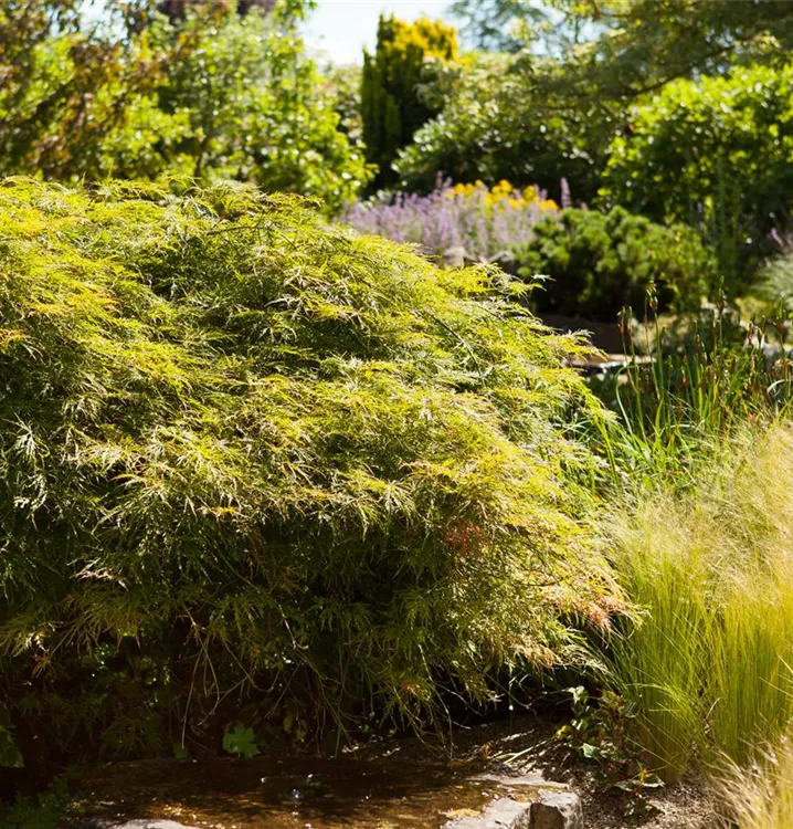 Der Grüne Schlitzahorn 'Dissectum' (Acer palmatum) ist ein schirmförmiger, überhängender, Strauch mit dekorativen sommergrünen, tief geschlitzten, hellgrünen Blättern.