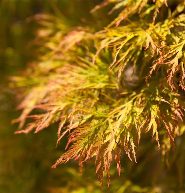 Hoher Blattschmuckwert. Die sommergrünen Blätter des Grünen Schlitzahorns 'Dissectum' sind hellgrün, tief geschlitzt, gegenständig. Diese sind etwa 6 - 11 cm groß. Grüner Schlitzahorn 'Dissectum' zeigt sich leuchtend orange-rot im Herbst.