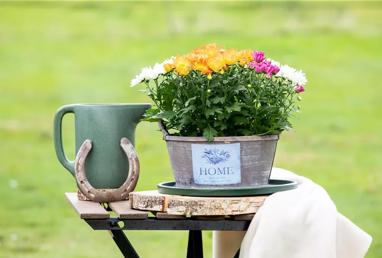 Damit sich die Blühwunder im Garten und auf dem Balkon auch so richtig wohlfühlen können, kommt es auf den richtigen Standort und die optimalen Bedingungen an. Die zu erfüllen ist aber nicht schwer, denn Chrysanthemen sind robust, pflegeleicht und nicht besonders anspruchsvoll. An einem sonnigen Standort fühlen sich die Schönheiten besonders wohl und werden dort viele bunte Blüten ausbilden. Ein nährstoffreicher Boden ist entscheidend für ein gesundes und kräftiges Wachstum. Durchlässig und locker sollte der Boden aber auch sein, denn mit zu feuchter Erde kommen Chrysanthemen nicht gut zurecht. Für eine gute Drainage kann Kies oder Sand in den Gartenboden gemischt werden. Im Kübel ist einfache Blumenerde die beste Wahl. Die enthaltenen Düngeanteile sorgen auch dafür, dass die Pflanzen immer mit ausreichend Nährstoffen versorgt sind. Und wer Verblühtes immer wieder aus der Pflanze putzt, der kann die ohnehin lange Blütezeit noch ein kleines bisschen in die Länge ziehen.