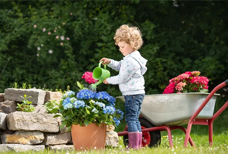 Von Anfang Frühling bis Mitte August kann der Gärtner Hortensien einpflanzen. Das Pflanzloch sollte mindestens doppelt so groß wie der Erdballen sein, damit sich die flachen Wurzeln auch gut entfalten können und nicht abgeknickt oder eingeengt werden. Nun wird die Pflanze eingesetzt und die ausgehobene Erde um den Wurzelballen herum eingefüllt. Zum Schluss wird die Erde noch einmal vorsichtig festgetreten und die junge Hortensie kräftig angegossen. Hortensien pflegen heißt vor allem auch, sie gut zu gießen, das fängt schon direkt nach dem Einpflanzen an. Denn eine gute Bewässerung nach dem Pflanzen begünstigt die Verwurzelung der Hortensie. Nun steht einer üppigen Blütenpracht nichts mehr im Wege.